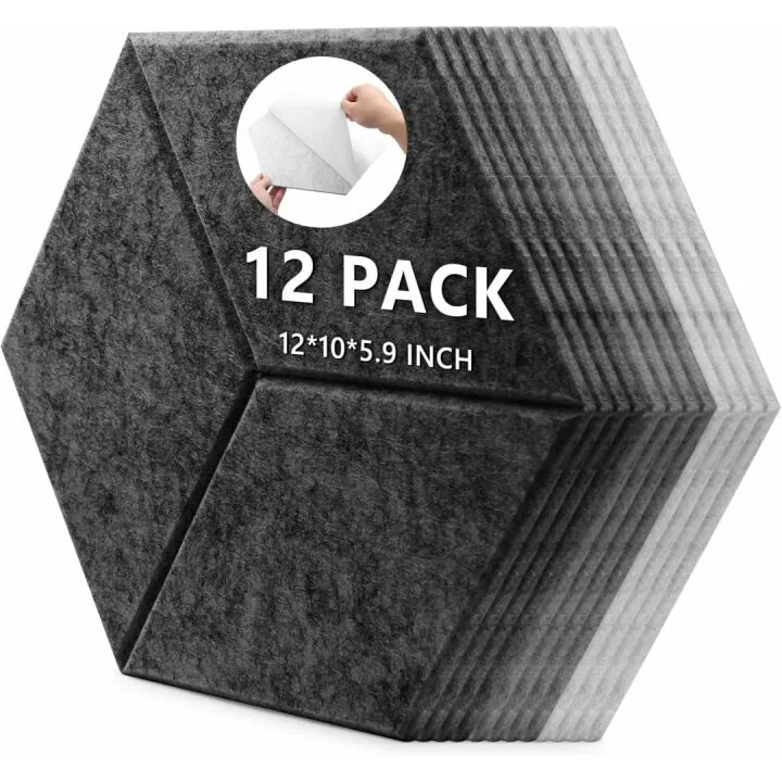 These acoustic panels are well-regarded for their rigidity and clean shapes, free from warping or bent edges. They come with a strong adhesive backing, ensuring they stay in place no matter where you mount them - even on ceilings. The panels measure 5/16 inches thick, with a distance of 11 11/16 inches between two points and 10 5/16 inches between parallel edges. This makes them versatile for various setups, whether for home studios, gaming rooms, or office spaces.