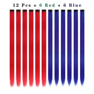 12PCS Colored Red and Blue Hair Extensions 22 Inch Colorful Clip in Hair Extensions Straight Synthetic Hairpiece for Women Kids Girls Halloween Christmas Cosplay, (Red+Blue)