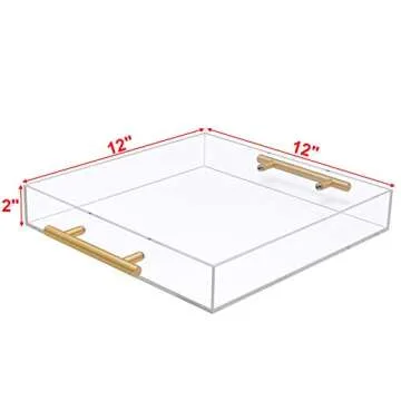 12x12 Clear Acrylic Serving Tray with Gold Handle, Clear Square Plastic Food Serving Tray for Breakfast Coffee Bread Kitchen Home Decor(12x12 inches)