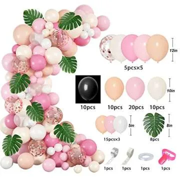 The kit includes 5pcs 12" rose gold confetti balloons, 20pcs 12" balloons in various colors, 50pcs 10" balloons, 45pcs 5" peach balloons, 8pcs palm leaves, and necessary assembly tools.