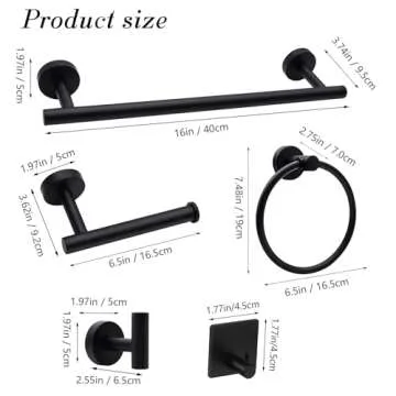 Show moreTransform your bathroom into a stylish haven with the 14-Pieces Matte Black Bathroom Accessories Set. Designed for both aesthetics and functionality, this premium set features an impressive array of essential items, including 2 x 16-inch towel bars, 2 x toilet paper holders, 2 x towel rings, 4 x robe and towel hooks, and 4 x adhesive hooks. Each piece is crafted from high-quality stainless steel, ensuring durability and resistance to rust and corrosion, which is crucial for the often damp bathroom environment.
