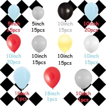 Show moreTransform your next gathering into a thrilling racetrack extravaganza with our 142 Pcs Race Car Balloons Garland Kit. Crafted for both boys and girls, this vibrant decoration set features a stunning array of dusty blue and black latex balloons alongside eye-catching wheel and checkered foil balloons. Perfect for birthday parties, baby showers, or any race car-themed celebration, this kit will surely rev up the fun. Whether you're planning an intimate family gathering or an extravagant birthday bash, this comprehensive balloon garland will set the stage for an unforgettable event.