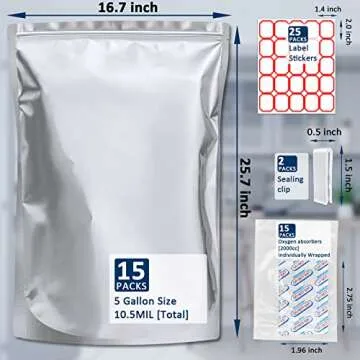 Each set comes with 15 individual oxygen absorbers, specifically designed for optimizing storage within these 5-gallon bags. The 2000cc oxygen packets are integral in reducing oxidation, thus prolonging the shelf life of your stored items. You’ll also find 25 versatile sticker labels (1.4” x 2”) included, enabling effortless organization of your food items, plus 2 sealing clips that secure the bags perfectly, preventing any air ingress. This level of attention to detail ensures that you can manage your pantry storage efficiently without compromising on quality or quantity.
