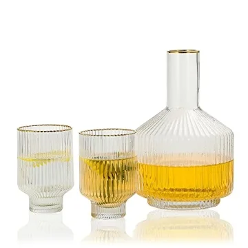 Show more Introducing the exquisite 1500° C TABLETOP Bedside Water Carafe with Cup — a stunning addition to any home that combines elegance with functionality. This beautiful farmhouse ribbed glassware set features a generously-sized 59 oz water carafe paired with two charming 11.5 oz tumblers, perfect for those midnight thirst quenchers without ever needing to leave your bed. Handcrafted by skilled artisans, each piece showcases a vertical stripe fluted pattern adorned with a luxurious gold rim, creating a striking centerpiece for your nightstand or guest room. Not only is this set practical, but it's also a unique decorative touch perfect for enhancing your home’s ambiance and impressing your guests.