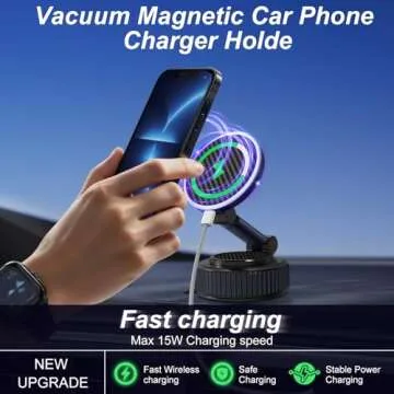 Show more Experience the future of mobile convenience with the 15W Magnetic Phone Charger Holder for Car. Designed with innovation in mind, this upgraded device features powerful 360° vacuum suction that keeps your phone securely in place while ensuring the utmost usability. Its compatibility with MagSafe technology provides an effortless charging experience for all iPhone models, including the latest iPhone 16, 15, 14, 13, 12 Pro Max, Mini, and even other magnetic phone cases. For those with non-magnetic phones, we include a special metal ring, allowing you to attach any phone securely.