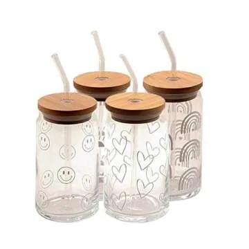 16 oz Drinking Glasses with Bamboo Lids and Glass Straw 4pcs Set - Cute Boho Patterns