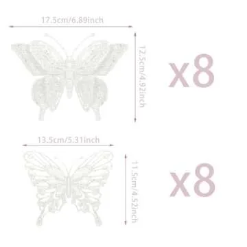 Show more Transform your holiday decor with the stunning Glittery Christmas Butterfly Ornaments! A delightful collection of 16 intricately designed butterflies, each measuring approximately 6.2'' x 4.3''. These beautiful ornaments feature clips for easy attachment, allowing you to enhance your Christmas festivities effortlessly. Crafted from high-quality plastic, the ornaments boast vibrant colors and a realistic appearance, ensuring they won't fade or break easily. Their durability means they can accompany you for many holiday seasons to come.