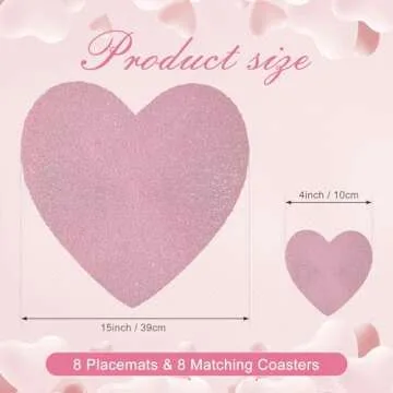 Show moreTransform your dining experience this Valentine's Day with our 16 PCS Heart-Shaped Placemats and Coaster Set. Perfectly designed to elevate your table decor, these pink PVC waterproof mats will enchant your guests and create a romantic atmosphere for any occasion. Crafted with durability in mind, each piece in this set guarantees long-lasting quality that can withstand daily use while maintaining its elegant design. With 8 place mats and coasters included, you’ll have just the right amount for all your gatherings—whether it's a casual family dinner or an elaborate dinner party.
