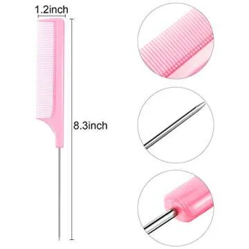 16 Pcs Rat Tail Comb Foiling Steel Pin Rat Tail Fiber Heat Resistant Teasing Combs with Pintail for Women Girls Hair Styling(Black and Pink)