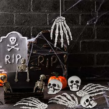 Included in this set are 12 striking plastic skull heads and a matching 2 pairs of skeleton hands — perfect for fulfilling all your decoration needs. With their perfect size, the skulls measure 12x9 cm (4.72x3.54 inches), while the hands are 5.7x4.5x4.2 cm (2.24x1.77x1.65 inches). Their compact dimensions ensure they are eye-catching, allowing your guests to experience unexpected thrills.