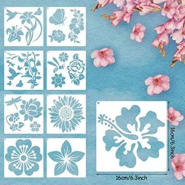 16 Pieces Stencil for Painting Sunflower Butterfly Floral Stencil Spring Summer Large Reusable Hummingbird Painting Templates and Metal Open Ring for DIY Craft on Wood Wall Home Decor(6.3 x 6.3 Inch)