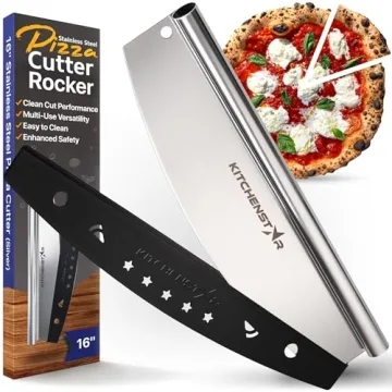 Show more Introducing the ultimate kitchen companion for pizza enthusiasts: our premium 16" Pizza Cutter Rocker Blade by KitchenStar. This elegant tool not only ensures clean and effortless cuts through any pizza crust, but also keeps your favorite toppings intact—say goodbye to messy slices and hello to perfectly crafted portions! Crafted with precision, this pizza cutter embodies quality and functionality, transforming every pizza night into a delightful experience.