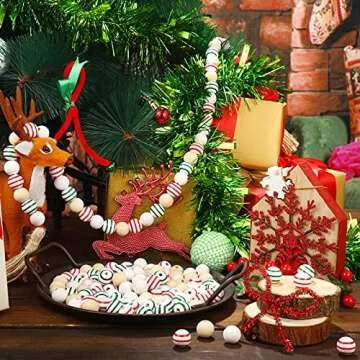160 Pieces Christmas Wooden Beads Craft Wood Round Beads White Green Red Stripe Wood Beads Boho Farmhouse Natural Spacer Beads for Craft DIY Garland Christmas Tree Decor