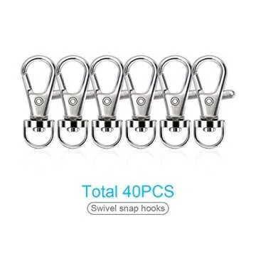 The set includes 40PCS of swivel snap hooks, key rings with chains, jump rings, and screw eye pins.