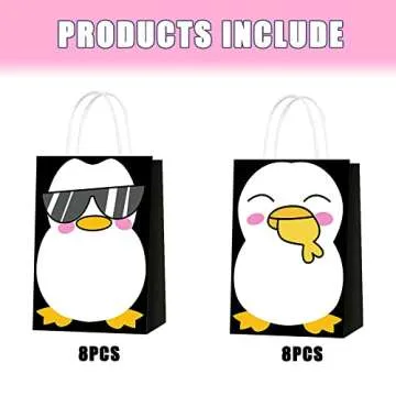 When compared to other party favor bags on the market, the Penguin Party Favor Bags stand out due to their unique, whimsical design coupled with durable construction. Many competitors offer flimsy options that tear easily, making them less reliable for holding gifts. Our bags not only maintain their integrity but also offer a fun aesthetic that is favorable with both kids and adults alike. This combination of quality and creativity provides an unmatched value in the party supplies category.