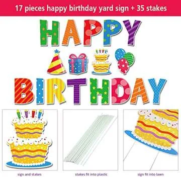 Show more Make every birthday unforgettable with our stunning Happy Birthday Yard Signs! This delightful set includes a total of 17 pieces, 13 of which spell out the heartfelt phrase 'Happy Birthday' beautifully. The remaining 4 pieces add a festive flair with adorable visuals such as a cake, balloons, gift boxes, and party hats. Transform your garden or yard into a vibrant birthday wonderland that will surely captivate your guests.