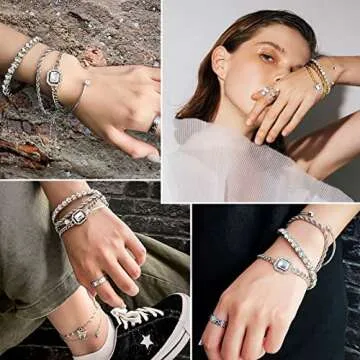 17IF 4 Pcs Dainty Silver Bracelets Set for Women 14K Plated Link Cubic Zirconia Paperclip Stack Layering Chain Adjustable Trendy Hand Jewelry (Silver)