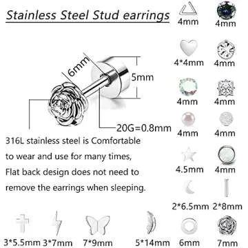 18 Pairs Cartilage Stud Earrings Set for Women Men Star Triangle Moon Heart Disc Ball CZ Small Stainless Steel Geometric Barbell Flatback Piercing (Silver)