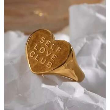 18k Gold Plated Stainless Steel Self Love Club Chunky Heart Shaped Statement Ring Fashion for Women Girls Gift Occassion Durable Fit Size 6 to 8
