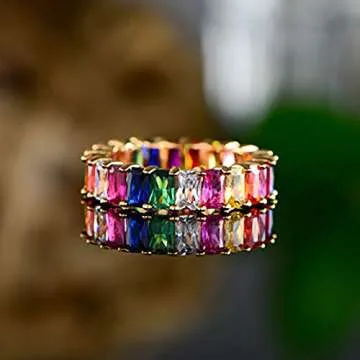18K Yellow Gold Plated Emerald-Cut Multi Color AAA Created-Gemstone Eternity Ring Rainbow