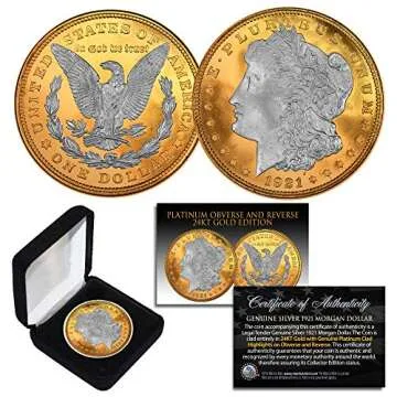 When compared to other collectible coins on the market, the 1921 Original AU Morgan Silver Dollar stands apart due to its combination of genuine 90% silver, 24KT gold cladding, and .999 platinum highlights. While many coins may offer one or the other, this piece brings together multiple precious metals, enhancing both its aesthetic appeal and investment potential. Additionally, the inclusion of a Certificate of Authenticity sets it apart, providing reassurance to collectors and enhancing its value in the market.