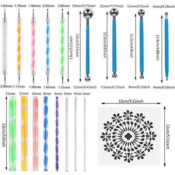 The set features 8 acrylic rods ranging from 1/8 inch to 3/4 inch (3, 4, 5, 6, 8, 10, 12, 15 mm), making it perfect for mandala rock painting or canvas artistry. It also comes equipped with both blue rubber handle ball stylus and stainless steel ball stylus pens, with ball diameters varying from 1mm to 18mm, giving you diverse sizes for every artistic need!