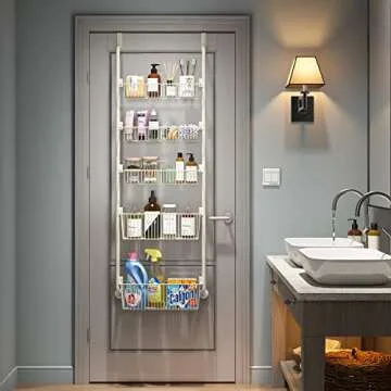 1Easylife Over the Door Organizer, 5-Tier Pantry Door Storage and Organization with 5 Baskets, Heavy-Duty Metal Back of Door Spice Rack Door Shelf Organizer (3x4.72+2x5.9 Width Baskets, Cream White)