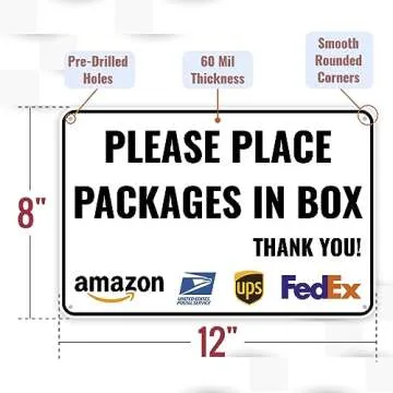 Show more Introducing the ultimate solution for package deliveries—the 1PC Delivery Sign For Packages. Designed with the modern consumer in mind, this 12 x 8 inch aluminum sign serves as a clear directive for delivery personnel, ensuring your packages are safely placed in the designated box. Made with 60 mil thick aluminum, this sign is not only visually striking but also built to endure. Impressively resilient, it withstands various weather conditions, thanks to its UV fade-resistant ink and construction materials, which means you won’t have to worry about fading colors or deteriorating quality over time. With vibrant, high-quality graphics, your message becomes instantly clear to any delivery professional, enhancing the reliability of your deliveries.