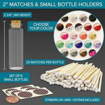 Illuminate your home with style! Introducing our stunning set of 2" Matches in 6 Glass Bottles by Thankful Greetings, designed to not only serve a functional purpose but also add a touch of elegance to your decor. Each glass jar, equipped with a charming cork top, contains over 20 high-quality safety matches per jar, amounting to more than 120 matches total. Adorned in your choice of over 20 vibrant colors, these matches allow you to express your personal style while keeping your home cozy...