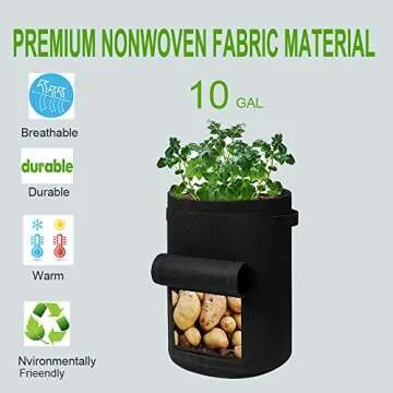 Show moreTransform your gardening experience with our 2 Pack 10 Gallon Potato Grow Bags, specifically designed for ease of use and maximum yield! These durable garden planters are crafted from breathable nonwoven fabric that encourages healthy root growth while providing superior drainage. Thanks to their large harvest window access flap, you can effortlessly check on your plants' progress and harvest them at the perfect time, all without disturbing their growth. The built-in handles make these bags easily portable, ensuring that you can position them exactly where your plants will thrive.