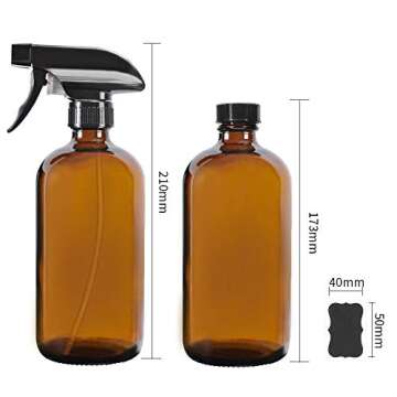 Show moreIntroducing the 2 Pack 16 oz Amber Boston Glass Spray Bottles, your ultimate companion for all things essential oils, beauty, cleaning, and DIY concoctions! Crafted from premium quality, UV-protective amber glass, these bottles shield your valuable liquids from harmful UV rays, ensuring that your essential oils remain potent and effective. Each bottle comes equipped with a versatile trigger sprayer that offers two distinct spray settings: a steady stream for targeted applications and a fine mist for gentle sprays, making them perfect for any task around the home or salon. Complete with durable black caps and four black chalk labels, organizing your products has never been easier.