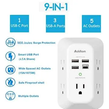Show more Introducing the Addtam USB Wall Charger Surge Protector - your ultimate solution for maximizing power access in any space! This innovative product features an intelligent combination of 5 AC outlets and 4 USB ports, including a USB-C fast charging outlet, all packed into a sleek, 3-sided design that fits snugly into any standard duplex outlet. Enjoy easy access to a power hub that accommodates multiple devices with its thoughtfully designed spacing, ensuring that you can charge and use your gadgets without worrying about blocking adjacent plugs or outlets.