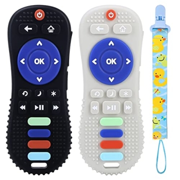 Show more Introducing the ultimate solution for your little one's teething woes - the 2 Pack Baby Teething Toys! Crafted to mimic the look and feel of a real TV remote, these silicone teething toys are designed to not only entertain but also soothe your baby's sore gums. Made from 100% FDA food-grade silicone, you can trust that they are completely safe for your baby to chew on. These teething toys are perfect for curious young minds and tiny hands, helping them explore the world while providing relief during those tough teething phases.