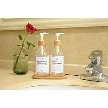 Show more Transform your kitchen and bathroom into a haven of modern elegance with our 2 Pack Dish Soap Dispenser for Kitchen. These stylish, 16oz dispensers come in a clear finish, crafted from premium BAP-free reinforced PET material that ensures durability and is resistant to breakage. The sleek design, paired with a chic bamboo pump, adds a touch of sophistication to any countertop while seamlessly blending with various decor styles, from farmhouse to industrial loft. Whether you're washing your hands, scrubbing dishes, or conditioning your hair, these dispensers provide a versatile and aesthetic solution.