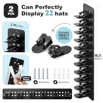 Show moreMeet the ultimate solution for hat enthusiasts everywhere—the 2 Pack Hat Organizer for Baseball Caps. Designed for both functionality and style, this modular hat rack offers a unique one-hat-per-layer design that not only protects the shape of your hats but also prevents any creasing. Whether you have an extensive collection or just a few favorites, this organizer allows you to display your hats proudly, keeping them accessible for everyday wear or showcasing your prized collection. With its sleek black finish, it adds a modern touch to any room, making it a stylish addition to your decor.