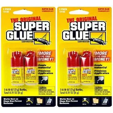 Show moreIntroducing the 2 Pack Super Glue: The Original Fix All Adhesive in convenient .10oz Non-Spill Bottles! Perfectly designed for precise applications, this set includes 4 bottles (2 packs of 2) of the original Super Glue, renowned for its fast-acting adhesive properties. Whether you're tackling minor repairs around the house or intricate craft projects, these easy-to-use, non-spill containers ensure you get the right amount every time. With a size of just 3 grams per bottle, it's compact enough to fit in your toolbox, junk drawer, or even your pocket, making it an essential addition to your repair toolkit.