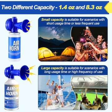 Show more Be prepared for any situation with our **2 Pcs 1.4 oz Mini Air Horn and 1 Pcs 8.3 oz Large Air Horn Combo**. These powerful air horns provide an **attention-grabbing sound** capable of reaching up to **120 decibels**, making them essential for emergencies, outdoor sporting events, and even for scaring away wild animals. Compact and portable, the **mini air horn** (1.4 oz) measures just **4.7 x 2.5 inches**, while the **large air horn** (8.3 oz) is **8.07 x 4.13 inches** in size, both designed to fit easily into your boating, camping, or hiking gear. Whether you are kayaking, jogging, or experiencing an unexpected situation, these air horns will ensure you are heard from **a distance of up to a mile (1,609 meters)**.