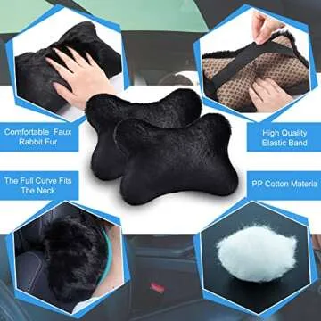 2 Pcs Furry Car Neck Pillows Black, Car Headrest Pillows Fluffy, Bone Shaped Plushy Faux Fur Neck Pillows for Car Seat Decorative, Comfortable Soft Neck Support Pillows for Car Headrest