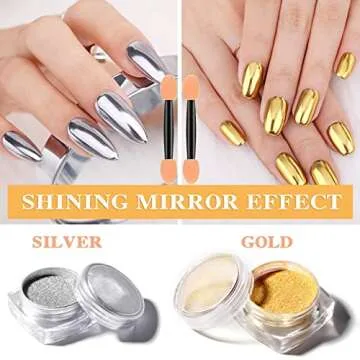 2 Pcs Gold Silver Chrome Nail Powder,Nail Art Mirror Glitter Effect Highly Pigmented Dust Metallic Holographic Mirror Nail Art Makeup Powders Chrome with Sponge Applicators