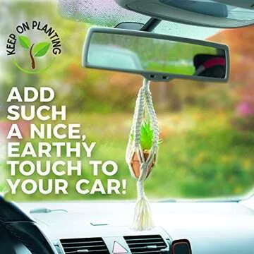Show more Elevate your driving experience with our charming boho car accessories that bring a pop of color and warmth to your vehicle! This unique plant gift box includes everything you need to create your own serene atmosphere while on the road. Inside, you'll find two faux flowers, two authentic terra cotta pots, and two macrame hangers complete with clasp metal rings for effortless attachment to your car's rearview mirror. It's not just functionality; it's a delightful way to express your personality. The entire set is designed to create a soothing ambiance, treating your senses to the refreshing scent of included grapefruit essential oil, allowing you to rid your vehicle of unwanted odors and elevate your mood on every drive!