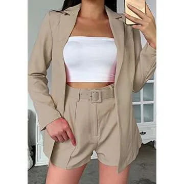 2 Piece Outfits for Women Long Sleeve Solid Open Front Blazer Shorts with Belt Casual Elegant Business Suit Sets Khaki