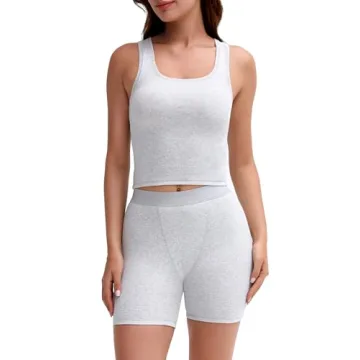 Show moreTransform your wardrobe with the exclusive 2 Piece Workout Casual Tank Cotton Rib Sets for Women. Perfectly designed for the modern woman, this matching outfit is made from premium ribbed cotton, ensuring a delightful dry hand feel that is soft against your skin. With just the right amount of stretch and breathability, these pieces will keep you comfortable and stylish whether you're hitting the gym, lounging at home, or out on a casual day. The chic scoop neck and slightly cropped length add a fashionable touch, while the matching girlfriend boxer shorts feature a soft elasticized waistband that stays in place without rolling up, making it the epitome of functional design. Experience the fabulous fit that hugs your curves and flatters your shape with this versatile outfit!