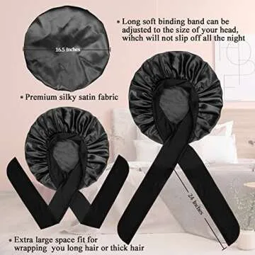 Show moreDiscover the ultimate solution for maintaining your luscious locks overnight with our 2 Pieces Adjustable Silky Hair Bonnet. Designed for women who cherish their hair, this sleeping cap is ideal for all hair types, including curly, frizzy, and long hairstyles. Its extra-large size, at 16.5 inches in width and a flexible head circumference of 21-25 inches, accommodates various hairstyles effortlessly, ensuring complete coverage and protection. Crafted from premium silky satin fabric, this bonnet reduces friction between your hair and pillow, preventing tangles, breakage, and dryness. Enjoy a peaceful night’s sleep without worrying about your hair; this exquisite accessory is gentle on your strands while offering a lightweight and breathable fit that feels luxurious against your skin.