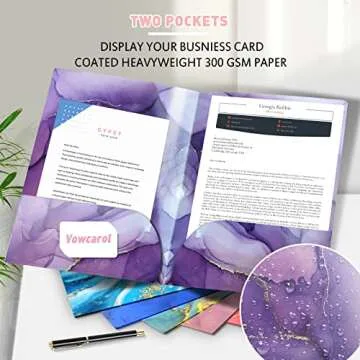 Show moreIntroducing our exquisite 2 Pocket Folders, the perfect blend of functionality and style for your document organization needs. Each folder comes in a vibrant selection of six unique marble designs, guaranteed to elevate your workspace or school supplies. Measuring at 12 x 9.6 inches, these folders are tailored to comfortably hold standard letter-size documents (11x8.5 inches) without compromising on quality or aesthetic. Featuring four-inch deep pockets on both sides, each folder can securely accommodate up to 30 sheets of paper, ensuring that your important documents remain unmarked and free from folds.