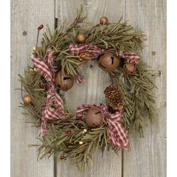 2 Primitive Holiday Evergreen Candle Rings with Rusty Bells, Stars and Homespun Ribbon