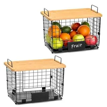 When compared to other storage baskets, the **2 Set Stackable Wire Basket** stands out due to its innovative stackable design and high-quality bamboo top. Unlike many wire baskets that are purely functional, this set offers beauty and practicality with its natural bamboo finish. Competitors often use synthetic materials, whereas our BPA-free bamboo adds a touch of elegance while being kind to the environment. The added functionality of using the bamboo top as a cutting board is a unique feature that enhances its usability.