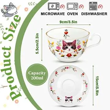Show more Delightfully charming and beautifully crafted, our 2 Sets 10 Oz Ceramic Teacup and Saucer Set is the perfect addition to your tea time or coffee ritual. Featuring an adorable cat and floral design, these white ceramic mugs display a delightful aesthetic that will brighten any gathering. Each cup holds a generous 10 ounces, offering ample space for your favorite espresso, tea, or milk. The sturdy handle provides a comfortable grip, ensuring ease of use. With their cute, whimsical appearance, these teacups are not only practical but also an expression of personality, making them an excellent choice for gift-giving or personal use. The durable ceramic material ensures these mugs will stand the test of time. Whether you're enjoying a quiet moment alone or hosting a lively tea party, this set adds a touch of charm to every sip.
