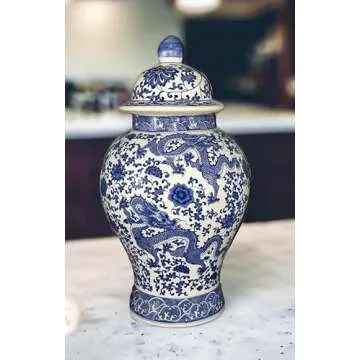 20" Classic Blue and White Porcelain Floral Temple Dragon Jar Vase, China Ming Style, Jingdezhen