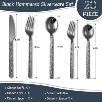 20-Piece Black Silverware Set, Hammered 18/10 Stainless Steel Flatware Set for 4, Food-Grade Cutlery Set, Tableware Set Including Fork Knife Spoon Set,Dishwasher Safe