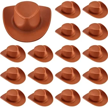 Show more Introducing a delightful set of 20 miniature cowboy hats, perfect for adding a touch of whimsy to your dollhouse or as unique party décor! Each mini cowboy hat is meticulously crafted from high-quality plastic, ensuring they are not only sturdy and reliable but also incredibly appealing to the touch. With a smooth surface and fine workmanship, these tiny hats look just like the real cowboy hats, making them a charming addition to any doll’s outfit.